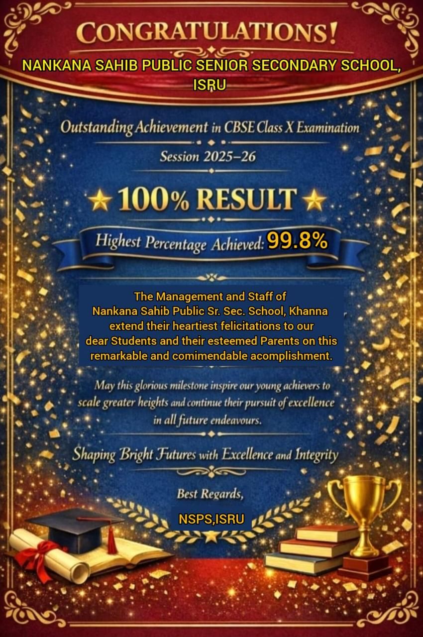 Nankana Sahib Public Senior Secondary School,Isru is a symbol of progressive and quality education. It is dedicated to holistic education of future leaders who will demonstrate newness in their professional competencies, integration in their personal lives and inclusion in their social contribution. It is our endeavour to establish a quality conscious institution where excellence is driving by values. Education, for us, is not a destination but a journey of discovery, of exploration, of introspection, of interrogation - a journey full of hope, promise and endless possibilities. Keeping this in mind, the mission of everyone concerned to the institution is to provide positive catalytic impulse to every child. We are looking at happy children, eager to learn, positive in outlook and ready to take on any and every challenge.